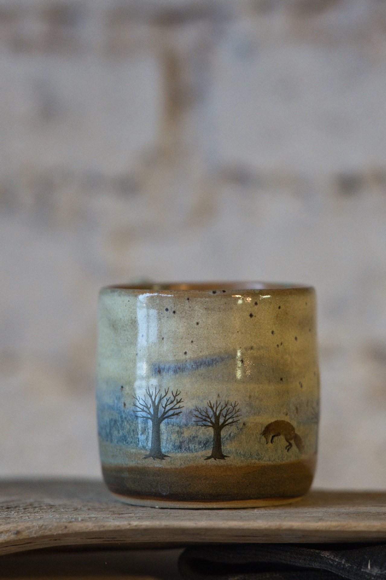 Ručně vyráběný keramický hrnek s jemnou zimní krajinou v chladných modro-šedých tónech. Siluety holých stromů a lišky v pohybu evokují klidné okamžiky přírody těsně před soumrakem. Jemně skvrnitá glazura a teplý odstín okraje dodávají hrnku přirozený, hřejivý charakter. Každý kus je originál, ideální pro tiché chvíle s čajem nebo kávou.