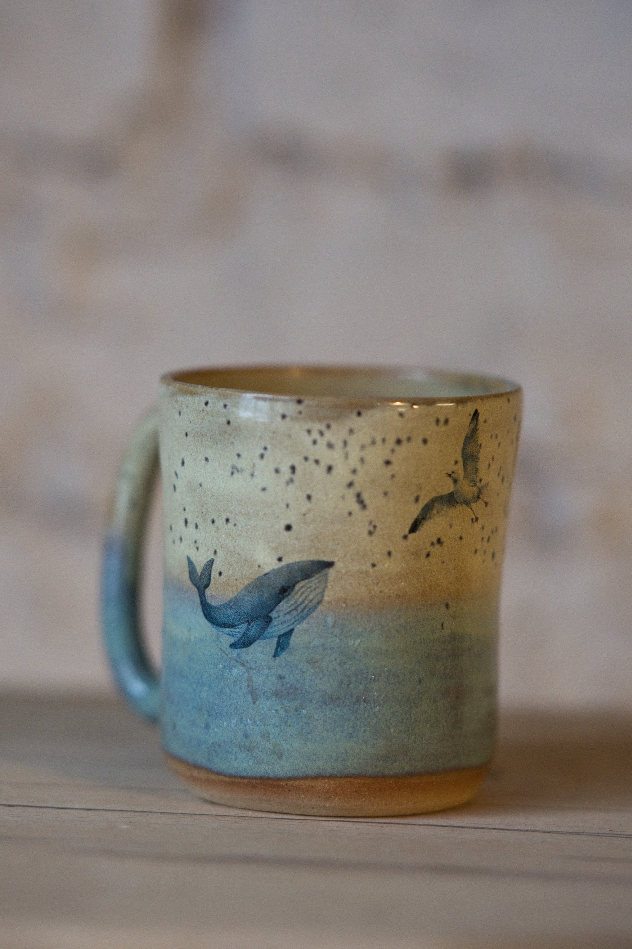 Keramický hrnek s jemným přechodem modré a pískové glazury, zdobený motivem velryby a ptáka. Připomíná klidné setkání moře a oblohy – chvíli ticha, kdy se svět zpomalí a každý doušek chutná o něco hlouběji. Ideální společník pro ranní kávu i večerní čaj.