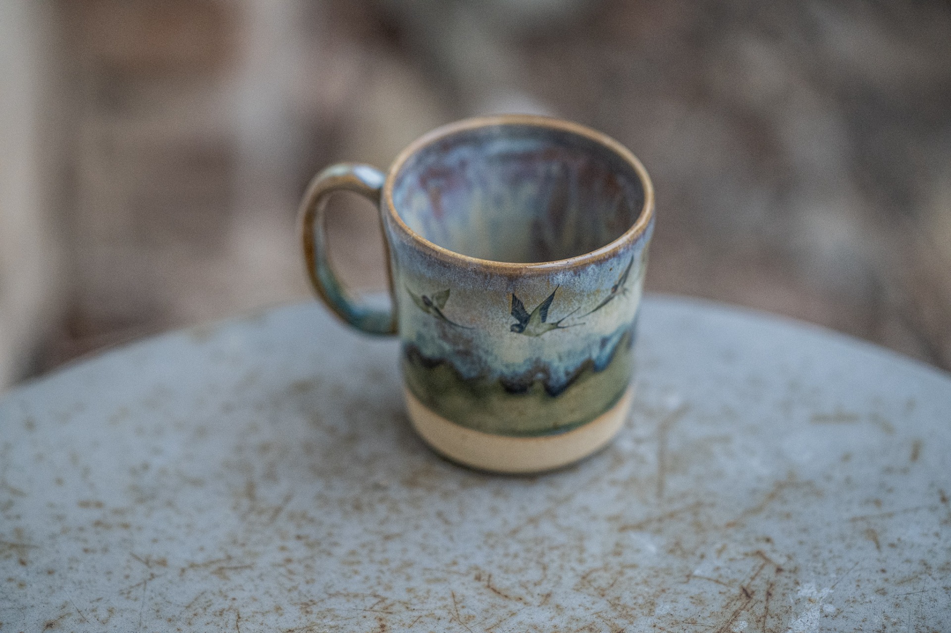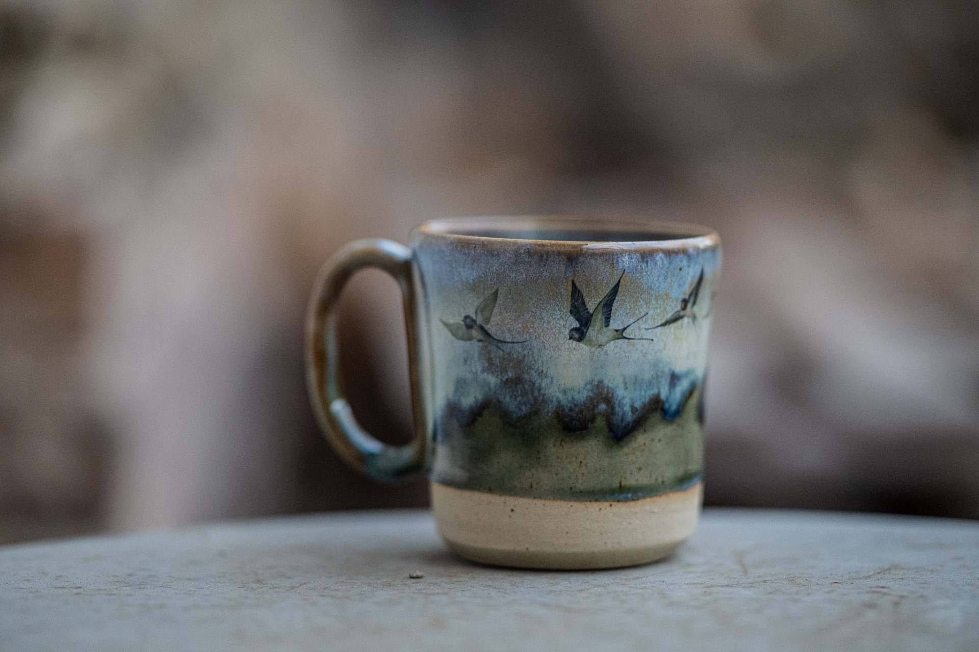 Sofistikovaný keramický hrnek s jemnou ilustrací vlaštovek v letu, zachycených v okamžiku lehkosti a svobody. Dynamický motiv ptáků se elegantně prolíná s vrstvenou, ručně působící glazurou v přírodních tónech zelené, modré a zemité béžové.